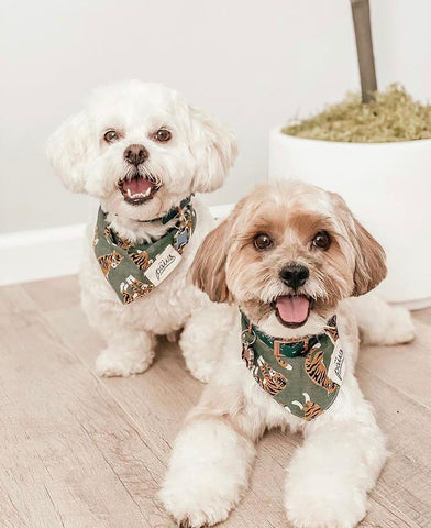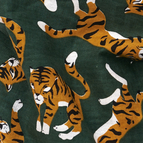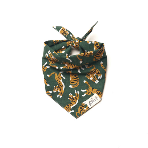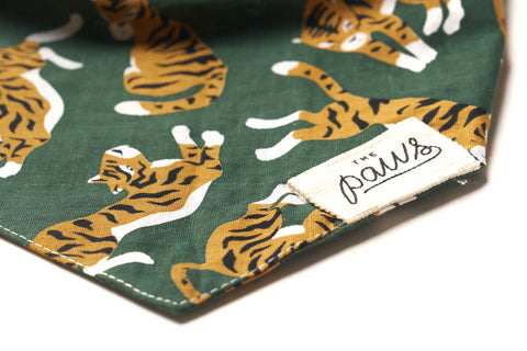 The Mowgli bandana from The Paws.Mowgli is simply radical tigers, dancing on deep forest green!
