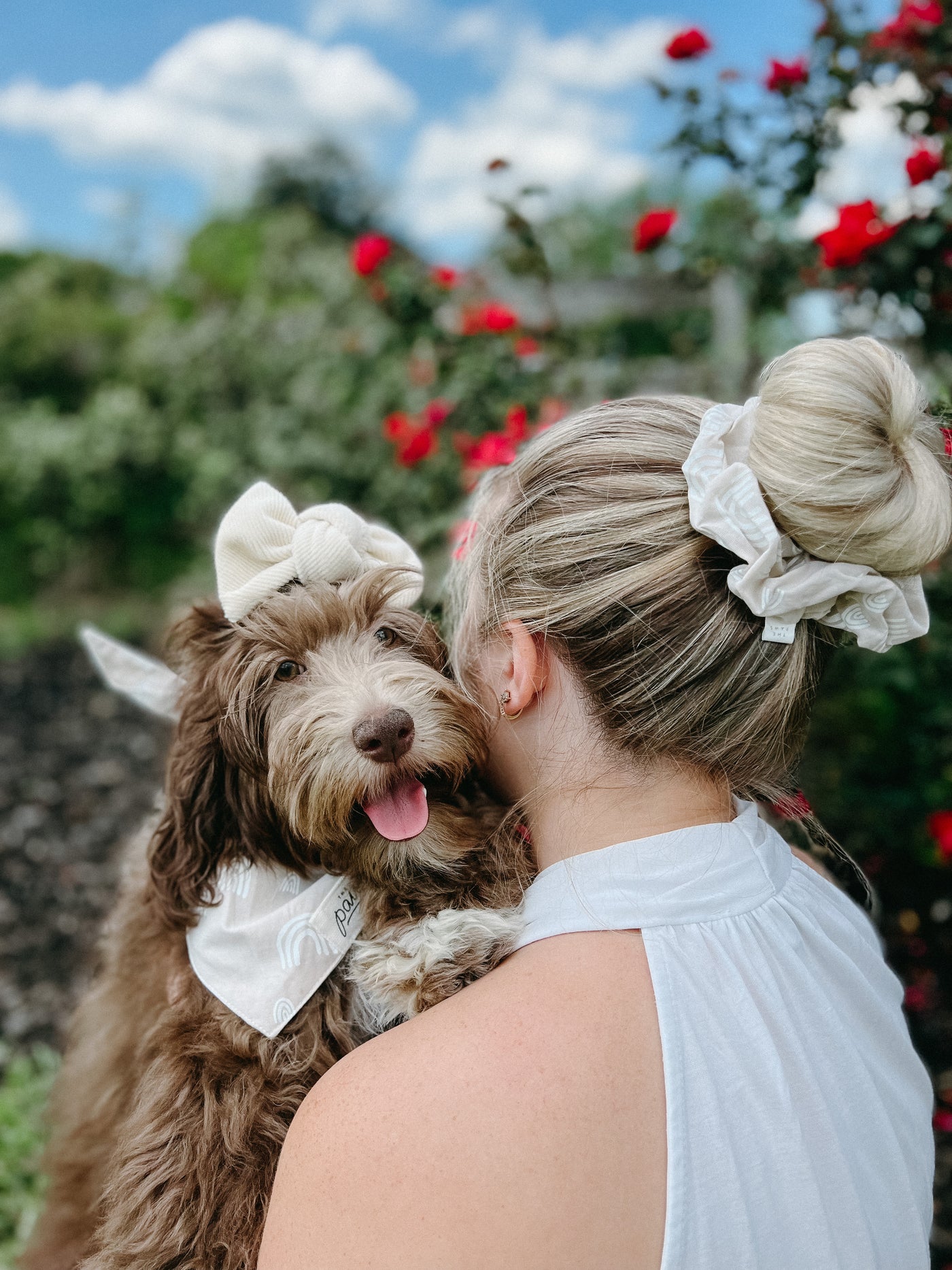 Available in a selection of favorite fabrics that we make our bandanas from. They have a little tiny Paws signature P on them - scrunchies give back too!