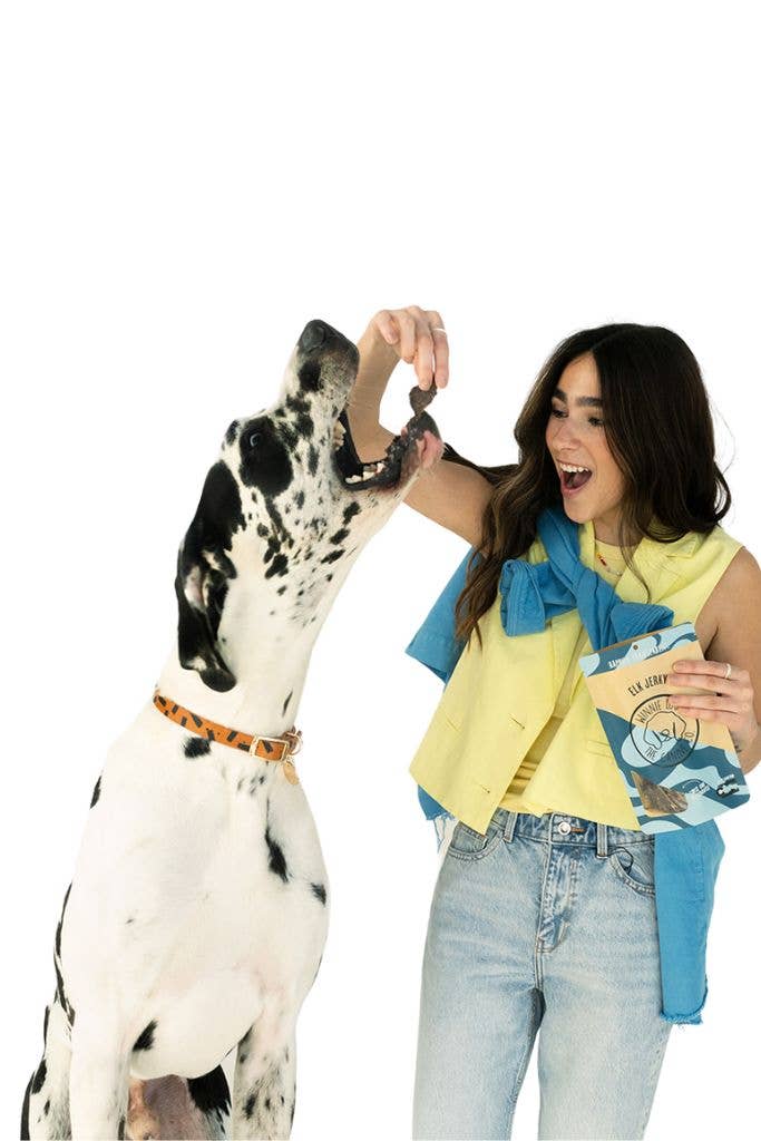 Our newest treat, Elk Jerky with Rosemary & Oregano! So good, our two-legged family members eat them as well. Crafted with over 1/2 pound of grass-fed elk jerky in each bag. We source our elk locally in the midwest. This is a great, lean protein, that rarely are allergens to pups.